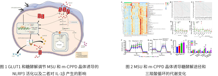 采用尿酸一鈉(MSU)和焦磷酸鈣(CPP)晶體刺激巨噬細胞,并對其進行體外代謝組學(xué)和實時細胞外流量分析,觀察巨噬細胞的代謝表型。采用 F-脫氧葡萄糖正電子發(fā)射斷層顯像、葡萄糖攝取實驗和葡萄糖轉(zhuǎn)化酶 (GLUT1)抑制的分子生物學(xué)方法,在體外和體內(nèi)評價有氧糖酵解對 IL-1β 產(chǎn)生的影響。